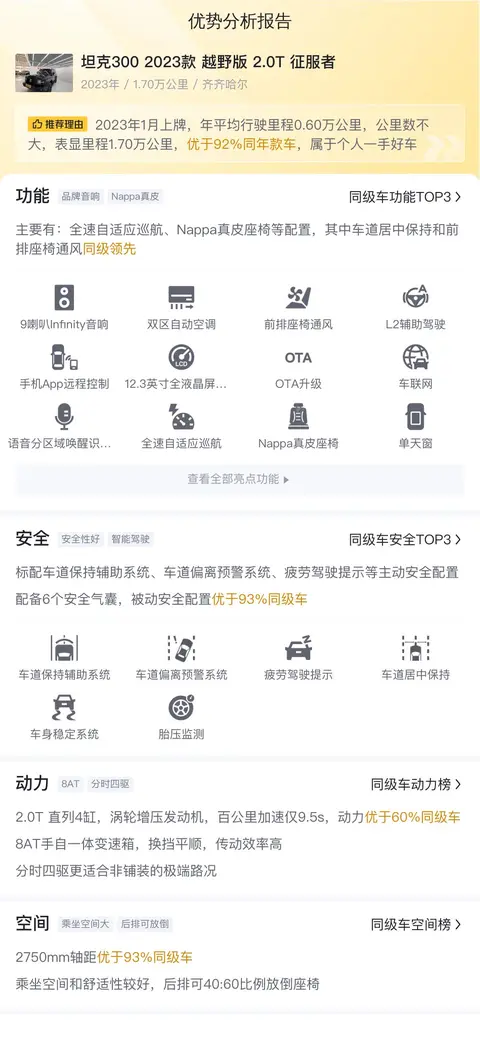 本车目前售价17.88万,预计再行驶2年后可卖16万,约折价9.1%。坦克300 2023款 越野版 2.0T 征服者从车况方面来看,全车原版原漆,內飾非常新,細節處都保留下了原廠的痕迹,車況相當新,從駕駛體驗和乘坐體驗反饋來看,該車動力表現出色,座椅通風加熱等功能實用。不過,作爲二手車,需要注意車輛的保養和維修記錄,以及是否存在潛在的故障問題。部分用戶反映車內噪音控制不盡如人意,尤其是在高速行駛時,胎噪和風噪可能比較明顯。儘管如此,綜合考慮其價格因素,这款车仍然具有相當高的性價比和市場競爭力,對於那些尋找一輛性價比高、車況好的二手SUV的消費者來說,無疑是一個不錯的選擇。