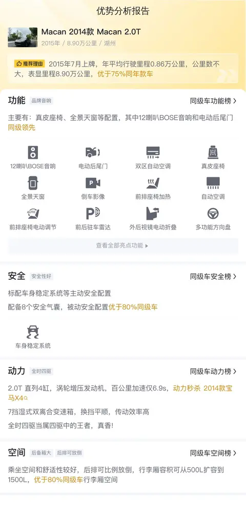 总的来说,这辆只要13.58万的Macan 2014款 Macan 2.0T是一辆性价比不错的豪华二手车型,保时捷的品牌光环和Macan的车型素质都为其增添了魅力。但需要注意的是,该车未提供检测报告,具体车况还需要线下结合车辆实际情况进行综合参考。