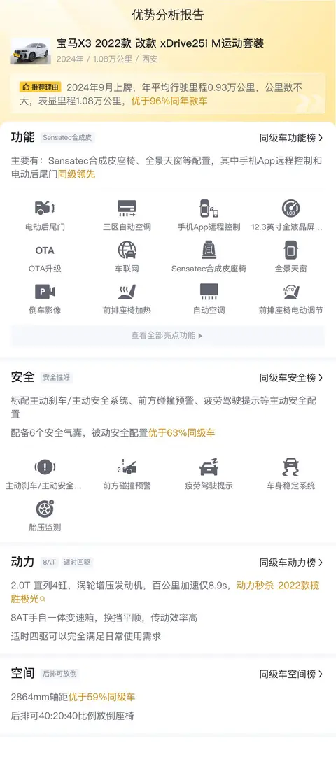接下来,让我们聚焦于二手市场的这辆宝马X3 2022款改款 xDrive25i M运动套装。这辆车来自美丽的古都西安,并在此地上牌,首次上牌时间为2024年9月,至今行驶里程为1.08万公里。车身颜色为白色,已过户1次。新车指导价为39.96万元,而当前的二手车报价为24.6万元,相较于新车价格,二手车在性价比方面更具吸引力。