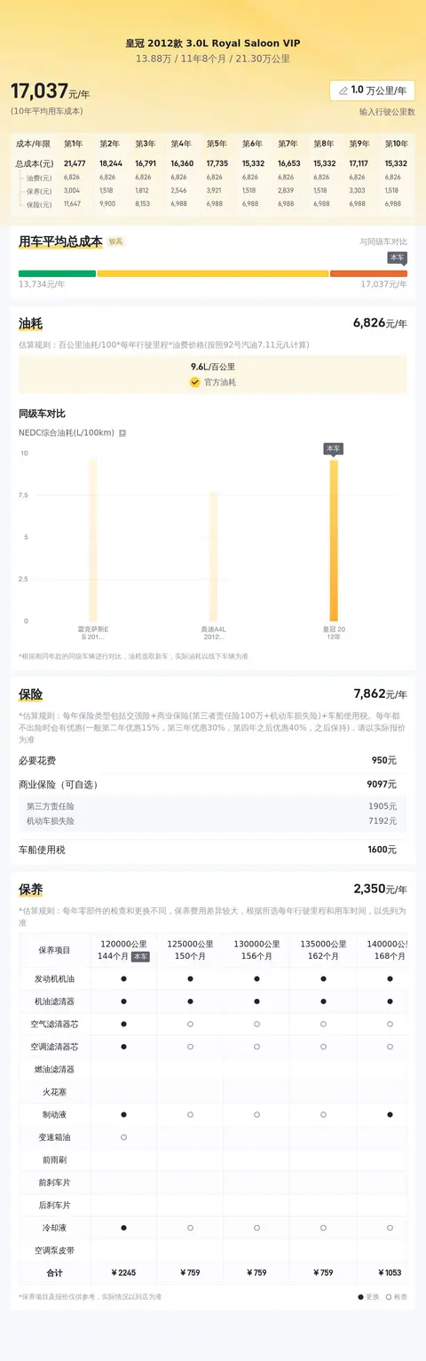 综上所述,这辆2012款皇冠3.0L Royal Saloon VIP是一款集豪华、舒适、动力于一身的二手车。它虽然已经有十多年的历史但依然保持着良好的车况;3.0L自然吸气V6发动机和6挡手自一体变速箱为驾驶者提供了充沛的动力输出;宽敞舒适的乘坐空间和丰富的配置也为乘客带来了愉悦的出行体验。如果你正在寻找一款性价比高、性能出色的二手车那么这辆2012款皇冠3.0L Royal Saloon VIP或许是一个不错的选择。