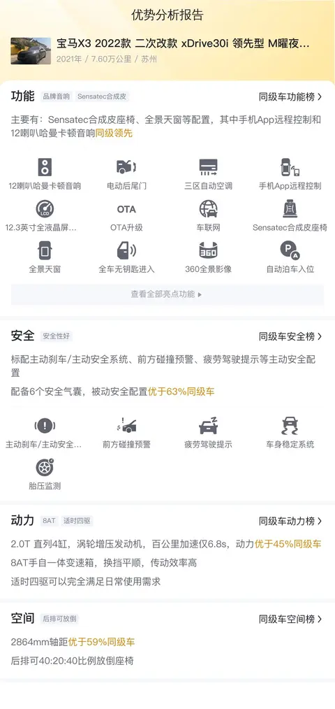 综上所述的新车含税价、用车成本、市场行情、优势分析、同款比价等数据仅供参考。在配置部分,因为二手车非标品,车辆可能会存在配置改装的情况,具体车况信息需要线下结合车辆实际情况进行综合参考。