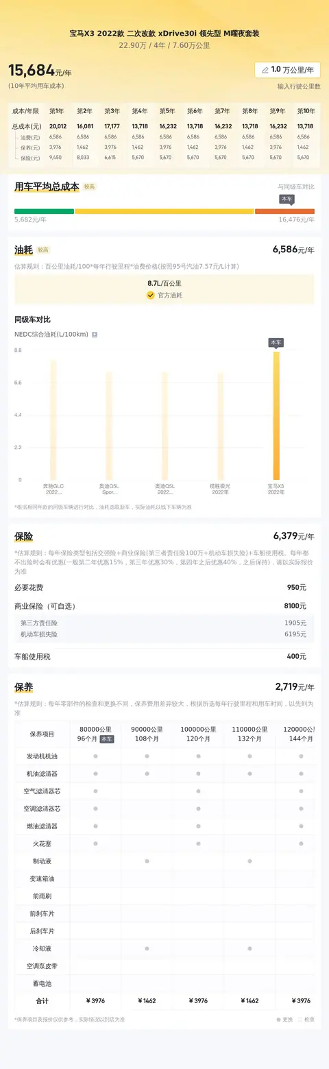 这辆车是中型SUV,车辆使用成本在可接受范围内。具体包括:每年燃油费用约14024元,保养费用约5104元,保险费用参考值为6990元,其他费用根据个人情况而定。按一年2万公里计算,平均每百公里使用成本约为85元。