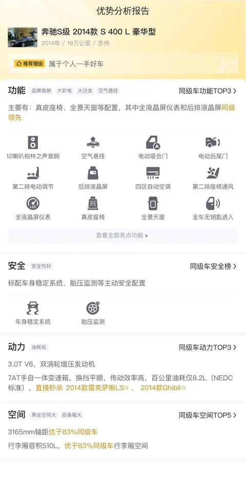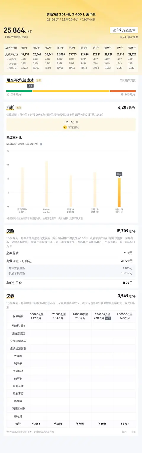 根据懂车帝的数据,这辆奔驰S级 2014款 S 400 L 豪华型的二手车报价在23.08-28.23万元之间。具体的价格因车辆的车龄、里程以及保养情况等不同情况而定,而本车的报价为23.98万元,相对较优。在用车成本方面,如上图所示,在百公里油耗8.2L的设定下,该车的年平均成本大约为2.58万元(按每年行驶1万公里计),而从该车11年3个月的车龄去看,未来3年的平均成本大约也是2.58万元每年,具体还需根据实际使用情况和市场变动而定。