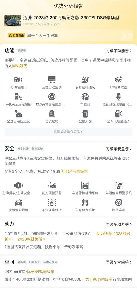 从动力性能来看,这辆迈腾搭载了2.0T直列4缸涡轮增压发动机,百公里加速时间为8.9秒,动力表现优于2023款君越和2023款凯美瑞。同时,它还配备了7挡湿式双离合变速箱,确保了换挡的平顺性和传动效率。在空间方面,2871mm的轴距优于54%的同级别车型,为乘客提供了宽敞舒适的乘坐空间。此外,后排座椅可40:60比例放倒,行李厢容积达到533L,优于96%的同级别车型行李厢空间,满足了家庭出行的各种需求。