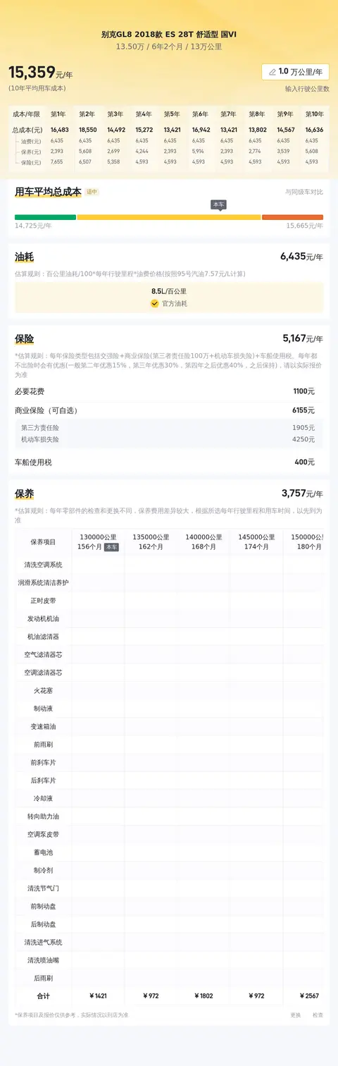用车成本方面,这款车的百公里油耗为8.5升,按照每年行驶2万公里计算,每年的油费约为14767元。保险费用方面,每年约6648元,包括交强险、商业险等。保养费用方面,每年约4108元,包括常规保养和零部件更换等。其他费用方面,每年约1600元,包括车船使用税、停车费、洗车费、过路费等。综上所述,这款车的年用车成本约为27123元,平均每月用车成本约为2260元,每天约为75元。这个用车成本在同级别MPV中属于适中水平,对于家庭用车和商务用车来说都是可以接受的。