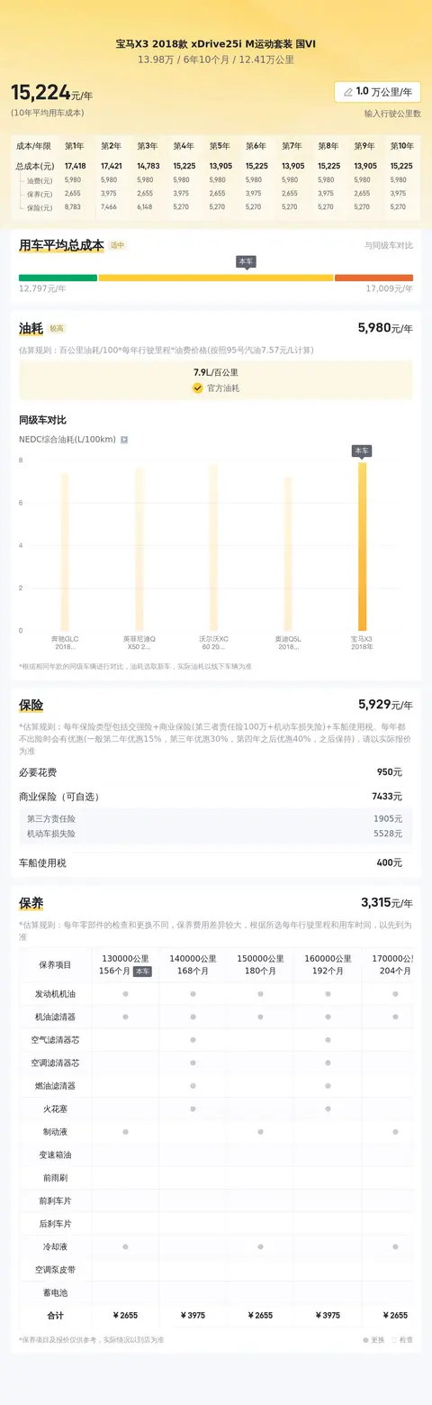 根据大数据分析,这款宝马X3 2018款 xDrive25i M运动套装国VI二手车的市场价格区间约为15.04万至18.28万元。而今天,我们为您带来的这辆实拍车型,车况良好,售价却仅为13.98万元,相较于市场价有着明显的优势。作为一款高端豪华SUV,这样的价格无疑为其增添了更高的性价比,对于追求品质与性价比并存的消费者而言,无疑是一个不可多得的选择。宝马X3 2018款 xDrive25i M运动套装国VI二手车的百公里综合油耗为7.9升(基于NEDC测试标准)。按照一年行驶2万公里计算,每年的油费大约需要1.18万元。此外,保险费用预估约为6449元/年,保养费用约为3168元/年。这些数据仅供参考,实际费用可能会根据个人使用习惯及车况等因素有所不同。但总体来说,这款车型在保持豪华品质的同时,也具备较为合理的维护与运营成本,适合追求高品质生活且注重经济效益的消费者选择。
