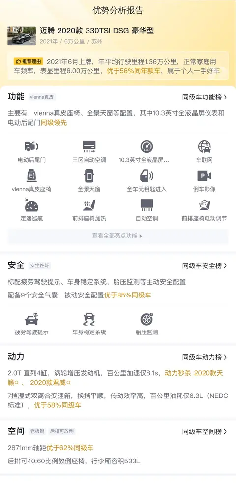 优势:德系车底盘质感很扎实,高速稳如狗说的就是大众煤。车子用得不多,功能全面,配置到位。市场保有量大,保值率高。这一代迈腾空间宽敞,尤其是后排,乘坐无压力。2.0T动力充沛,家用可以放心。