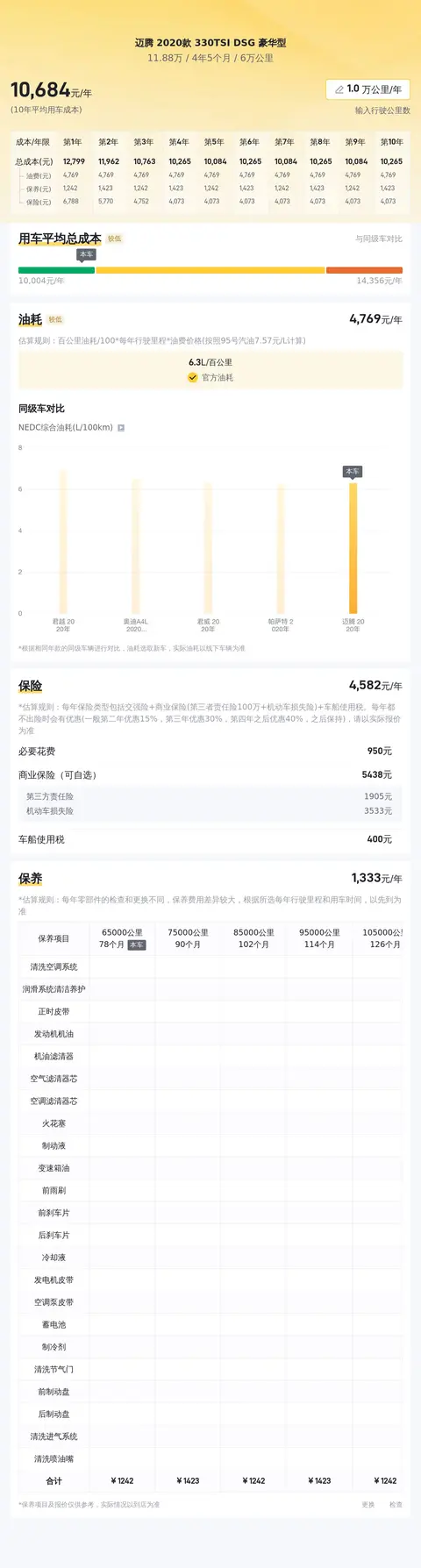 据估算,同级车的最低用车成本是6506元/年,最高是13783元/年,迈腾 2020款 330TSI DSG 豪华型是11304元/年,不算低,但也算正常水准。
