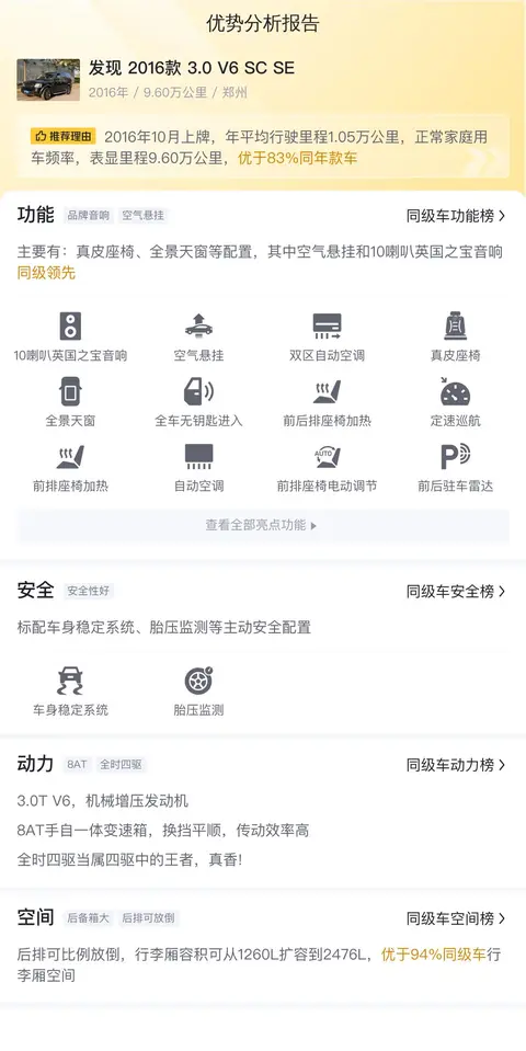 这辆车的具体版本是——发现 2016款 3.0 V6 SC SE,2016年10月上牌,跑了9.6万公里,黑色车身,转手过2次,目前车牌所在地和车辆所在地都在郑州。这车新车卖82.8万,现在二手卖28.9万。