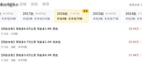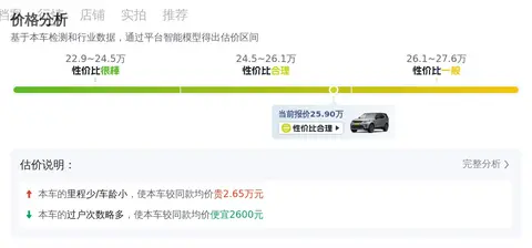 首先就是车辆的里程,少于均值3.4万公里,+21200元,其次是车龄,少于均值0.3年,+5300元,过户次数,多于均值0.4次,-2600元,颜色,深灰色,0元,综合下来,该车的价格还是比较合理的。
