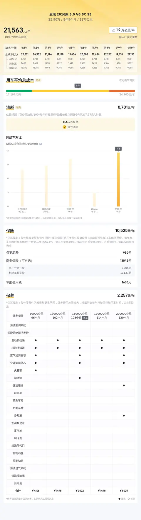 此外,据估算,同级车的最低用车成本是17468元/年,最高是27776元/年,发现 2016款 3.0 V6 SC SE是22138元/年,所以用车成本适中。