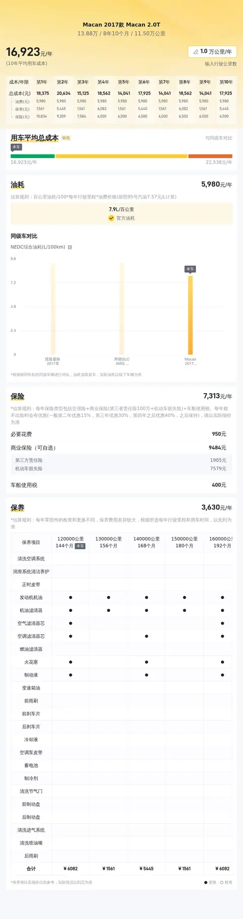 据估算,Macan 2017款 Macan 2.0T的用车成本较低,因为同级车的最低用车成本是16598元/年,最高是21779元/年,Macan 2017款 Macan 2.0T的是17168元/年,所以较低。