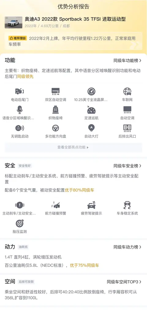 对于追求性价比的消费者来说,这辆奥迪 A3 在配置、性能、安全和舒适性方面均表现出一定的竞争力。特别是对于首次购买奥迪品牌的消费者或者需要一辆日常通勤车的用户来说,它提供了一个相对经济且不失品质的选择。考虑到其合理的价格定位,这辆车在二手车市场上具有一定的吸引力。