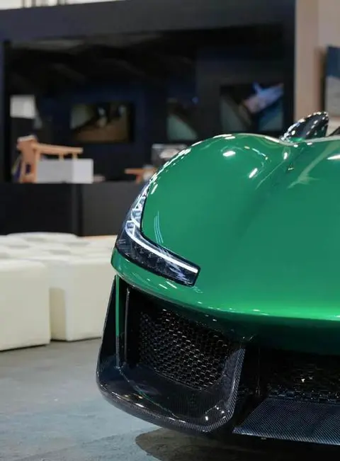 NEBULA NEXT 01的外观设计极具战斗感,整体造型非常拉风,车身采用绿色涂装,前脸配备了夸张的空气动力学套件。车头的设计下压,形成强烈的运动感,四条长短不一的灯条构成了独特的“L形”大灯,辨识度相当高。车辆还配备了六辐式轮毂和黄色刹车卡钳,尾部则搭载了大尺寸固定式扰流尾翼,尾灯呈现出蜂窝状的矩阵造型。