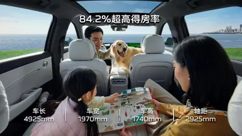 让我印象深的是引擎盖上那道可点亮的红旗标识,从格栅一直延伸到车头,晚解锁车辆时会缓缓亮起,过年带着家人晚归,远远就能看到车灯和标识。侧面采用船式车身结构,4925×1970×1740mm的车身尺寸搭配2925mm长轴距,看着大气却不笨重,一条上扬的腰线让车身多了几分灵动,不会显得呆板。