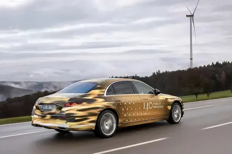 外观核心升级集中在前脸部位,新车换装全新前格栅及前后灯组,气质更趋豪华。前格栅尺寸较现款增大20%,镀铬饰条从3根增至4根,外圈黑色边框与大灯无缝衔接,提升前脸整体性,格栅外边框及发动机舱盖立标均带发光效果,夜间点亮后仪式感拉满。大灯采用开眼角设计,内部嵌入两颗专属三叉星徽光源,这一原本EQ系列专属的元素首次应用于S级,搭配三组LED星芒日行灯,形成极具辨识度的“星星眼”造型。