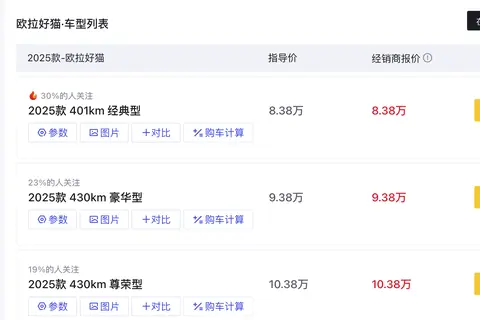 2025款好猫有三款配置,价格从8.38万到10.38万。别看网上说入门版只要8万多,实话实说,我更推荐大家看看9.38万的430km豪华型。