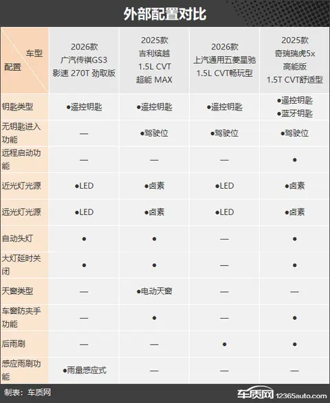 外部配置环节,瑞虎5x的整体表现相对更加丰富,唯独遗憾的就是其仅配备了卤素大灯。传祺GS3的雨量感应式雨刷以及吉利缤越的电动天窗,都算是各自的亮点配置,对于特定消费者有着一定的吸引力。五菱星驰在这个环节表现平平,缺少让人眼前一亮的加分项。