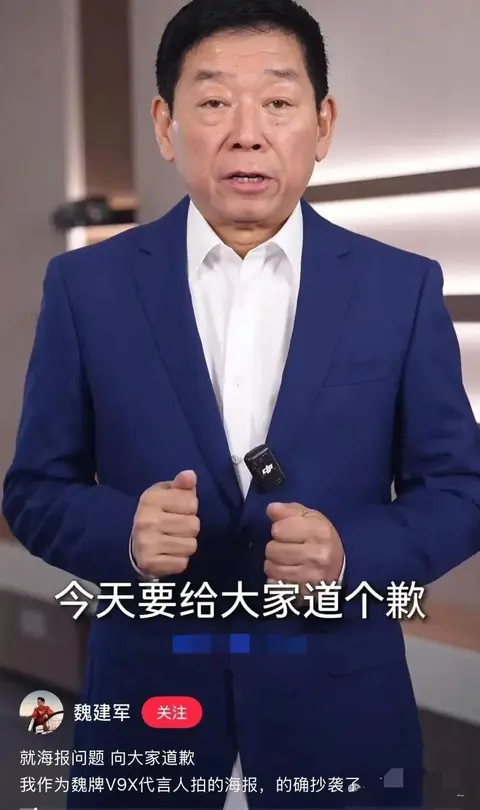 先把事儿捋得明明白白:3月5号,魏牌官宣自家董事长魏建军当新车V9X代言人,还同步发了宣传海报,暗红背景、人物站姿、车辆摆放、车灯光影,几乎和一年前路虎揽胜运动版的广告创意一模一样,顶多就是手部动作差了一丢丢,被网友和原创设计师直接戳穿“抄袭”。换做有些企业,大概率会冷处理、甩锅外包、甚至嘴硬狡辩,可魏建军的操作完全反着来——3月6号晚上直接发视频道歉,开门见山认死理:“那张海报的确是抄袭的,不能有任何辩解”,不光向路虎、原创设计师和网友致歉,还拍板说自己和长城愿意承担全部法律与经济责任,不推责、不找补,还主动揽责说自己作为代言人审核把关不严,承诺整改内部流程,坚决杜绝再犯。